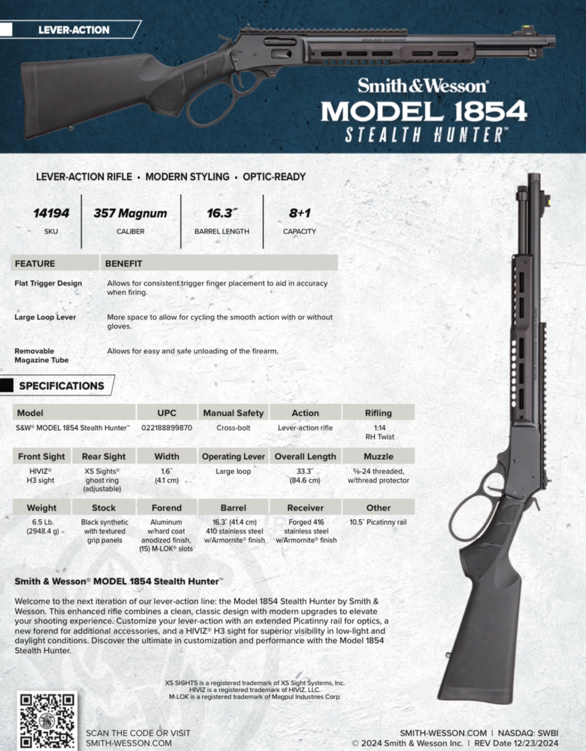 Welcome to the next iteration of our lever-action line: the Model 1854 Stealth Hunter by Smith & Wesson. This enhanced rifle combines a clean, classic design with modern upgrades to elevate your shooting experience. Customize your lever-action with an extended Picatinny rail for optics, a new forend for additional accessories, and a HIVIZ® H3 sight for superior visibility in low-light and daylight conditions. Discover the ultimate in customization and performance with the Model 1854 Stealth Hunter™.